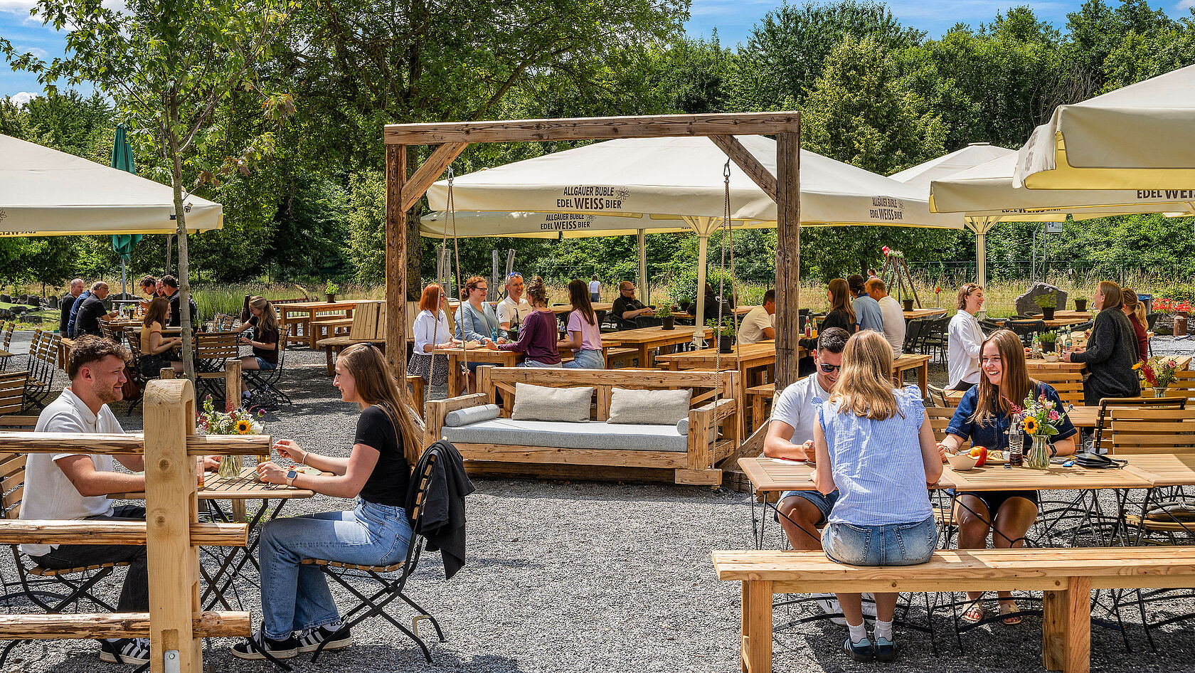 Nach einem Tag voller Eindrücke auf der Landesgartenschau heißt es bei uns: Zurücklehnen, anstoßen, genießen. In unserem brandneuen Biergarten erwartet Dich eine entspannte Atmosphäre in grüner Umgebung, kühle Getränke, leckere alpine Speisen, gemütliche Sitzbereiche für Paare, Familien und Gruppen und viele tolle Erlebniswelten. Auf unserer neuen Abenteuer Alm können die Kids toben, beim Almgolf ist Geschick und beim FunFußball jede Menge Ballgeschick gefragt.